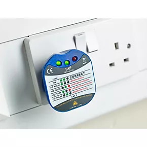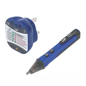 Professional, pocket size electrical testing kit comprising of a non-contact AC voltage detector pen with modern, ergonomic design and soft finger grip; and a mains socket tester with LED indicators to show condition of circuit sockets. LEDs indicate 5 socket wiring conditions: correct, missing earth, live/earth reverse, live/neutral reverse and missing neutral. Audible buzzer indicates correct polarity.