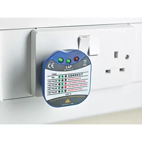 Pocket-sized, mains socket tester with LED indicators to show condition of circuit sockets.